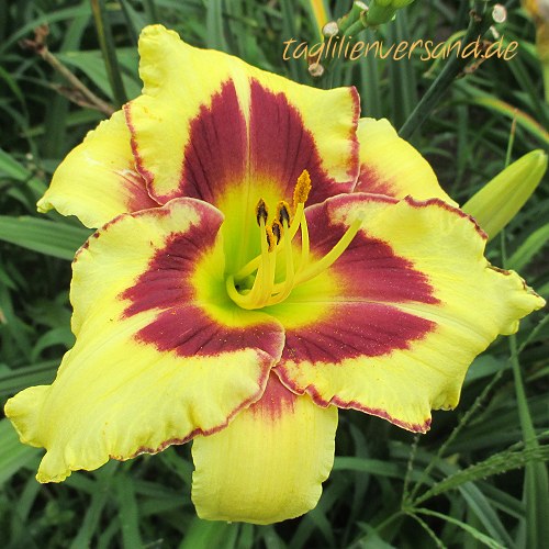 gelb mit dunkelrotem Rand und Augenzone, sehr blühfreudig