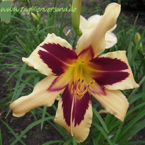 cremegelb mit dunkelweinroter Augenzone, nachblühend