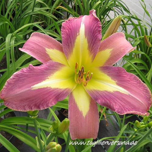 lavendelrosa mit hellviolettem Schein um eine gelbe Applikation, grüner Schlund, duftend und nachblühend